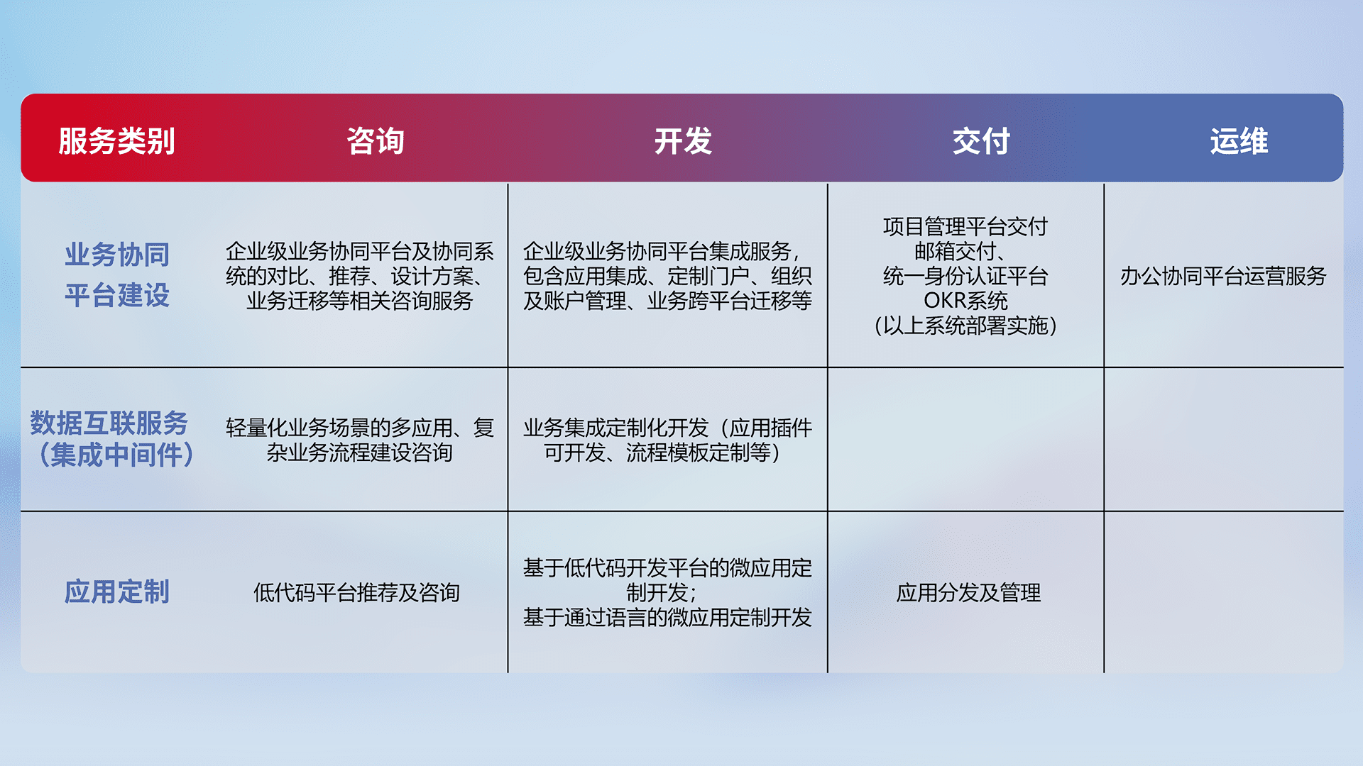 针对钉钉、、、、企微、、、、IDaas等平台级产品提供产品的规划、、方案、、、、交付、、定制化开发等服务,,,,实现如统一协同办公、、智能客户服务、、、、混合会议管理、、智能数据查询、、等业务场景,,实现数字化转型。。。。