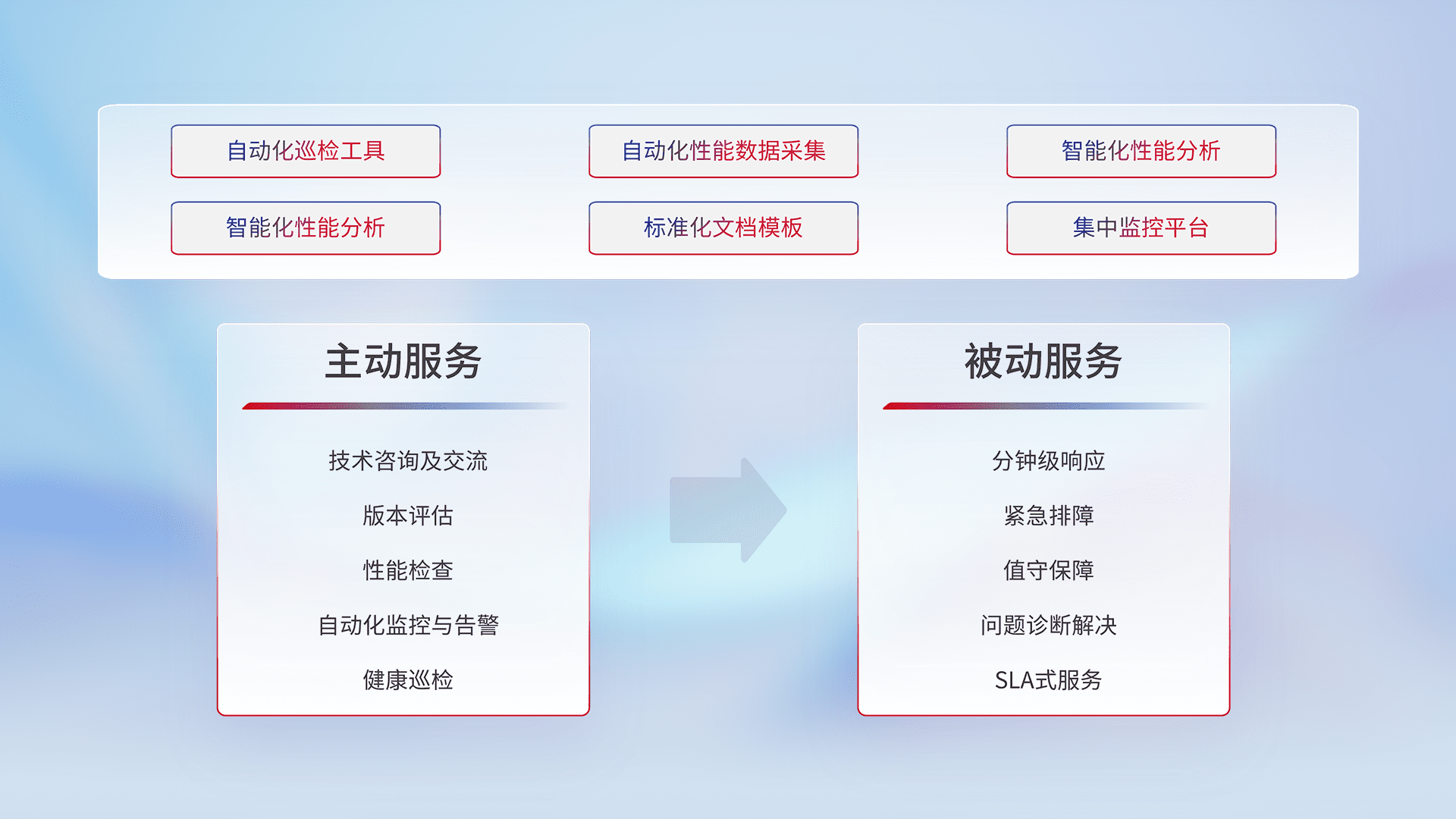 智能化工具和标准化文档,,保障服务质量,,,提供主动服务(包含技术咨询、、、、版本评估、、、性能检查、、自动化监控与告警、、、、健康巡检)和被动服务包含(分钟级响应、、紧急排障、、、、值守保障、、问题诊断解决、、、SLA服务)。。。。